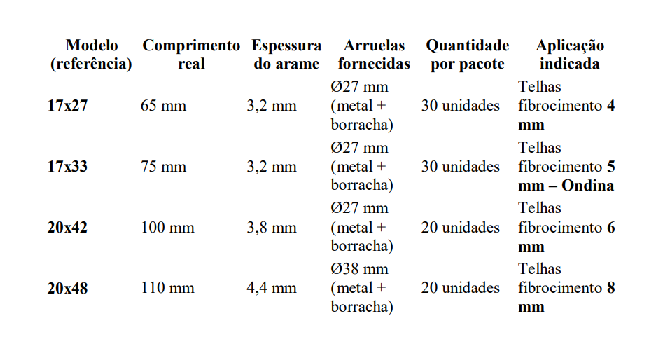 Uso principal: fixação de telhas de fibrocimento modelo Ondina (5 mm de espessura)